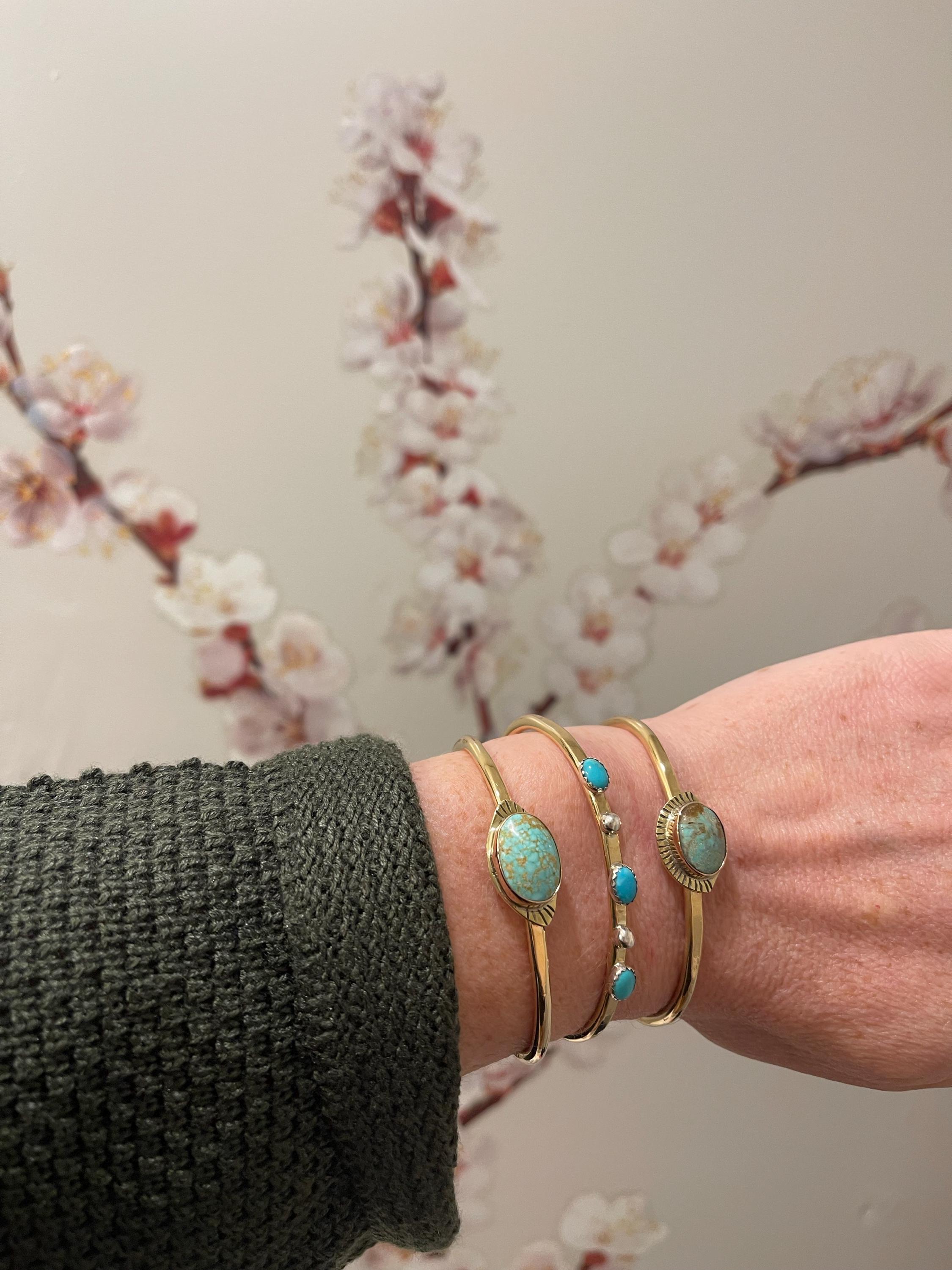 Natural American Turquoise, in recycled Brass or Sterling Silver, these cuff bangles are wonderful worn alone or stacked.