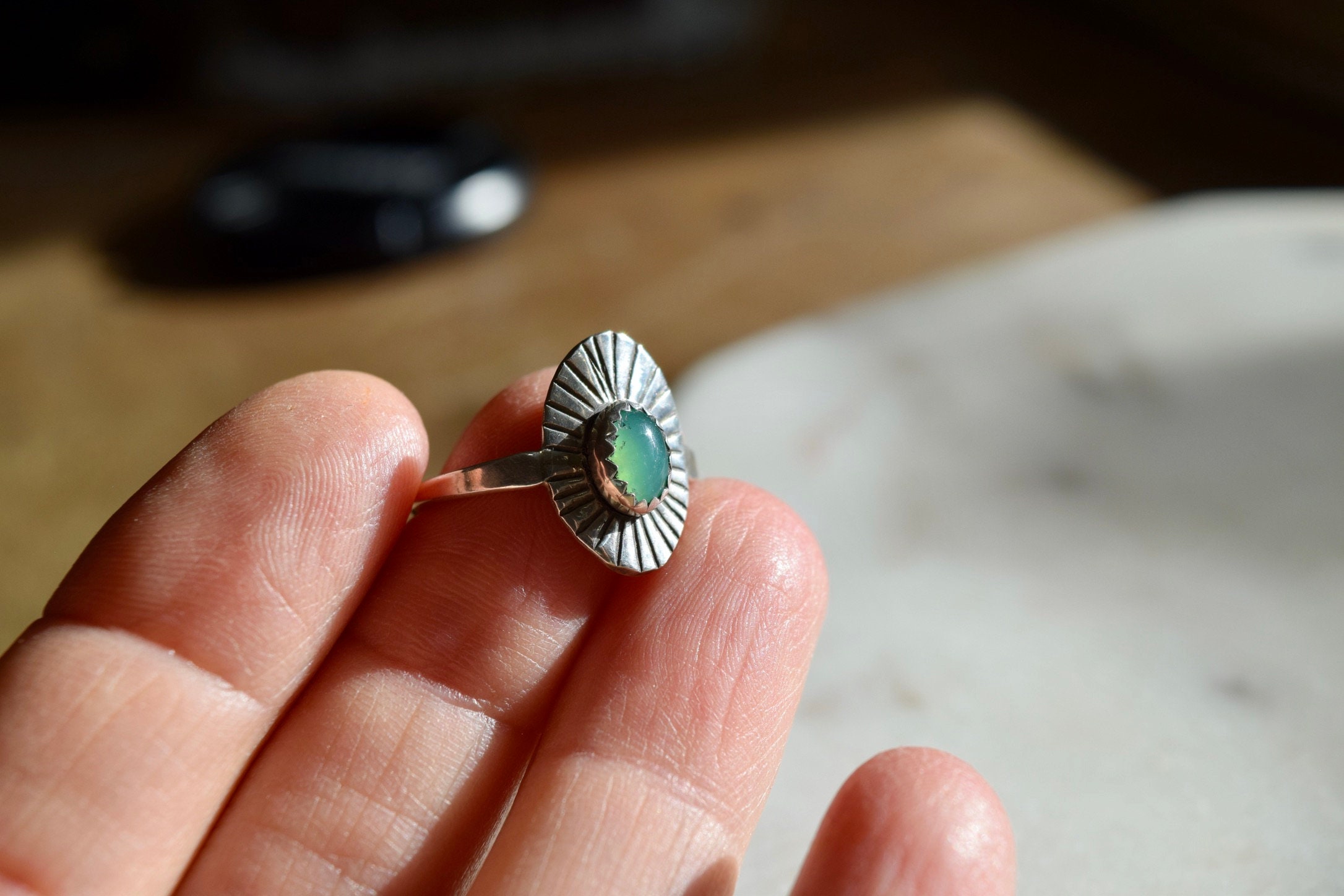 Finished Rings pictured are Turquoise, Rainbow Moonstone and green Chrysoprase. In addition to those, current gemstone choices are Aquamarine, Iolite, Pink Tourmaline and Ruby.